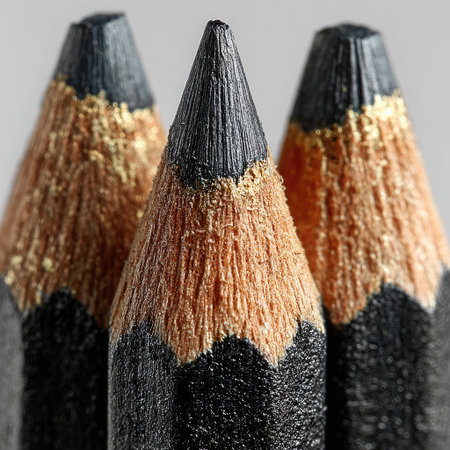 Three pencils are prominently displayed in a macro shot against a plain backdrop. The pencils' tips are sharply focused, showcasing the texture of the wood and the dark graphite. The composition features a shallow depth of field, highlighting the detail and structure. This image could be used for educational, illustrative, or creative projects.