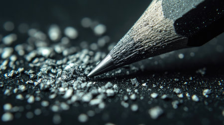A detailed close-up of a sharpened pencil tip resting on a shimmering pile of graphite dust. This macro shot highlights the texture and materials, perfect for art and design themes.