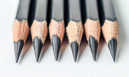 This close-up image features a row of sharpened pencils arranged on a textured fabric surface. The focus highlights the pencil tips, emphasizing their ready-to-use condition and potential for creativity, making it ideal for artistic projects or educational content.