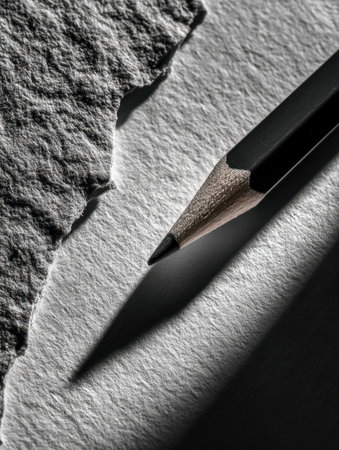 A finely pointed graphite stick creates a stark shadow on rough, fibrous paper, emphasizing contrast and craftsmanship in artistic detail.