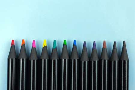 Multi-colored black pencils on a blue background in a row