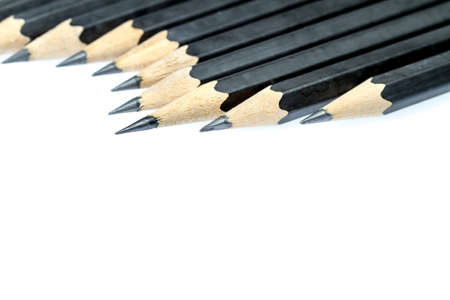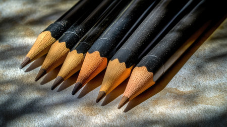 A close view of black colored pencils lined up with sharp tips against a softly textured background, capturing artistic tools in a creative workspace.