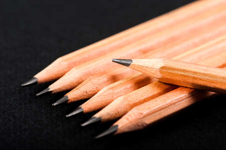 Stack of sharpened pencils in pyramid on black background, artistic arrangement. Creativity and art supplies concept