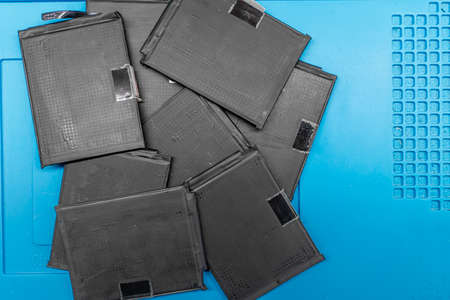 Top view of front and back of smartphone and stationery on dark modern office desk