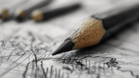 a close-up view of sharpened pencils resting on textured paper. The monochrome image highlights the details of the pencil tips and the surface they are placed on. ai generated.