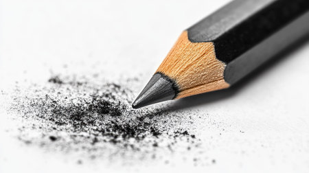 A close-up image of a sharpened pencil resting on white paper, surrounded by graphite dust. This image conveys creativity, art, and craftsmanship.