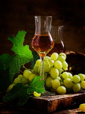 Glass full of grape Italian vodka «grappa» near bottle and bunch of grapes on old canvas background