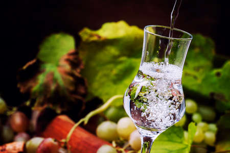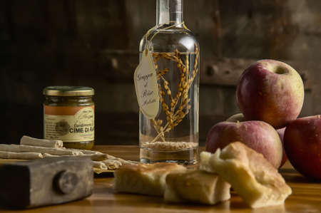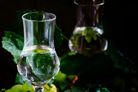 Traditional Italian vodka, still life in rustic style, dark wood background, selective focus