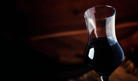 Grape brandy in shot glass, dark brown background. Panoramic banner with copy space