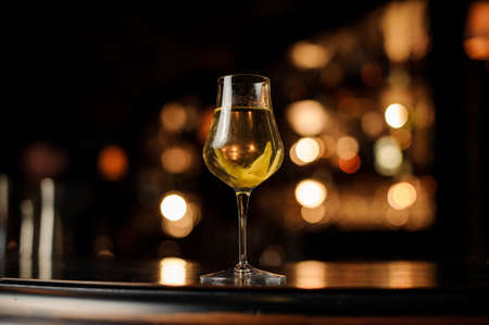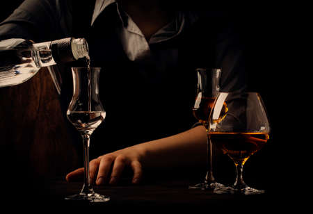 Bartender pours Italian grape vodka grappa in glass. Bottles of strong drinks on black bar counter background with lights