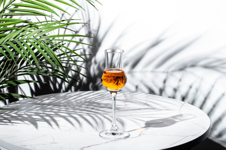 Enjoying a refined glass of grappa, an Italian grape distillate, against a backdrop of lush greenery and gentle shadows