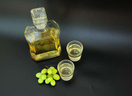 White grappa on wooden background, fresh grapes, selective focus