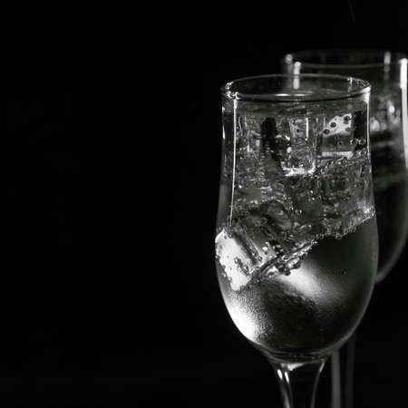 Pouring alcoholic drink in glass with natural ice. Steamed glass with strong alcoholic drink. Copy space.