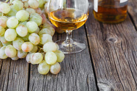 Glass of brandy with brush of grapes on table, harvest holiday