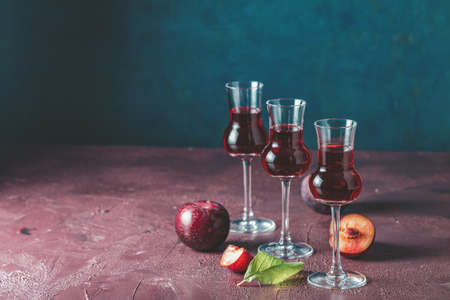 Plums strong alcoholic drink in grappas wineglass with dew. Hard liquor, slivovica, plum brandy or plum vodka with ripe plums on dark blue and claret bordeaux concrete surface.