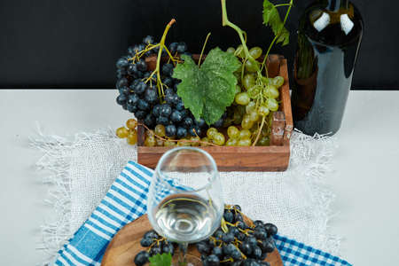 A bunch of grapes and with a glass of wine and a bottle on white table