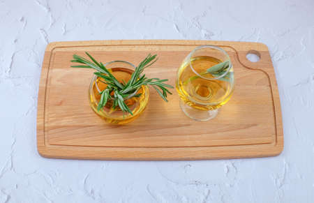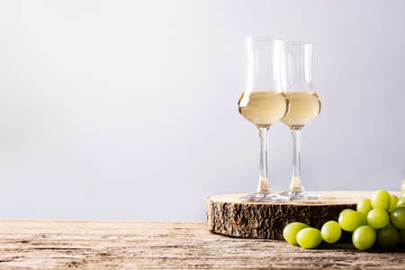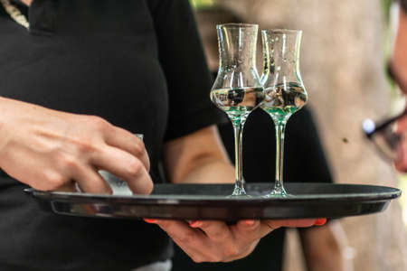 Two glasses of liquor or grappa on a plate served in a german biergarten of a vineyard