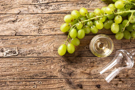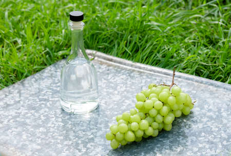 White wine bottle, glass, young vine and bunch of grapes against green background on a tray. Summer grape drink