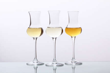 Strong drinks, spirits and distillates in glasses: cognac, grappa, vodka, whiskey and other in assortment. White background with hard light and harsh shadows