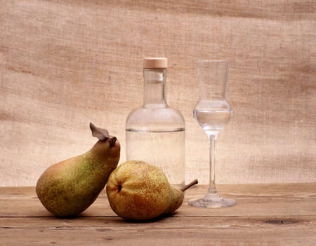 Two Abate Fetel pear with alcohol bottle and glass, horizontal
