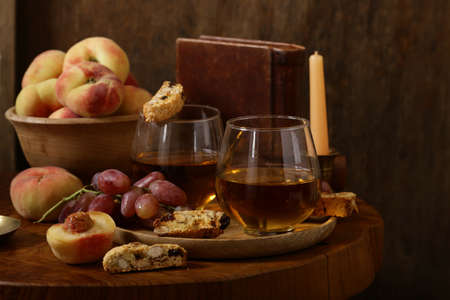 French apple strong alcoholic drink, still life in rustic style, vintage wooden background, selective focus