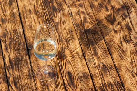 Glass of white wine on vintage wooden table