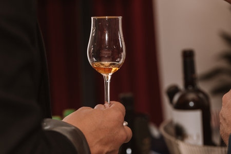 Glass of cognac held in hand at a presentation of selected drinks with friends and lovers of strong drinks.
