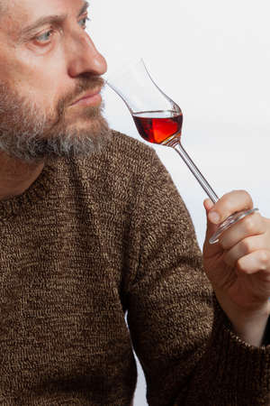 Grappa tasting. Man with gray beard in brown sweater sniffing glass goblet with grappa close up