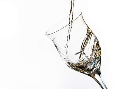 Serving a slightly tilted glass with white wine. White background. Concept of movement, elegance, taste.