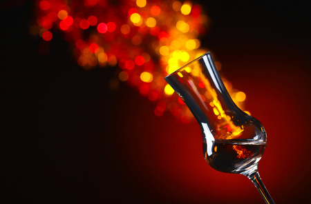 Italian golden grappa drink on black background