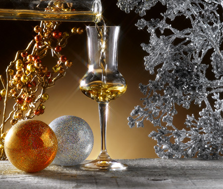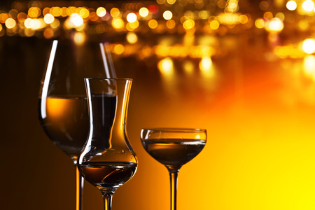 Italian golden grappa drink on wooden background
