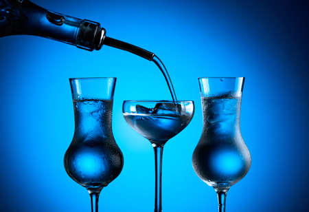 Vodka is poured from bottle into glasses with ice. Frozen glasses on a dark blue background.