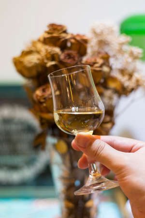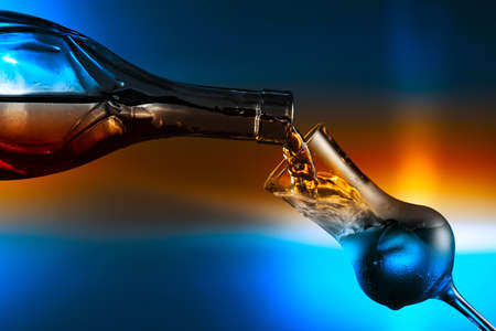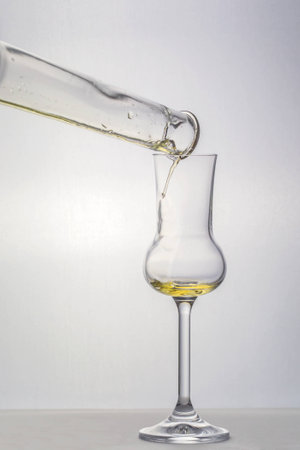 Digestive tulip of premium alcohol. The drink is poured from a bottle into a glass. Copy space.