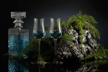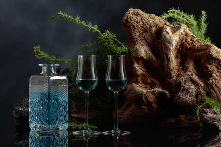 Blue gin on a black reflective background. Juniper branches, stone and old driftwood are in the background.