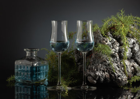 Blue gin on a black reflective background. Juniper branches and gray stone are in the background.