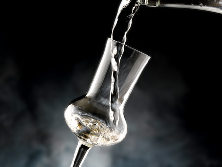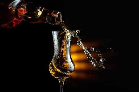 Strong alcoholic drink being poured from a bottle into a glass. Snifter on a black background. Copy space.