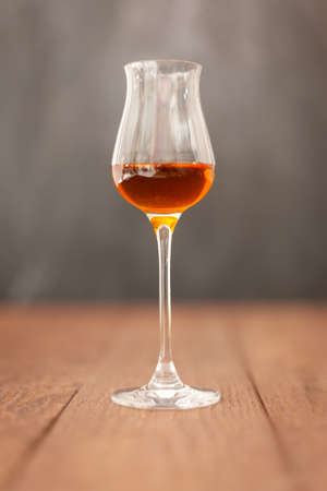 Grappa glass with brandy or sherry or calvados on wooden table with light grey background.