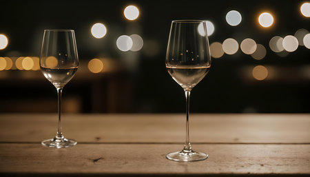Two empty clean glasses on mirror surface against beige background. Space for text