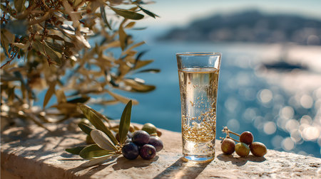 A tall glass of golden arak with bubbles, placed on a stone ledge beside fresh olives and olive branches, with the blue sea and islands in the background.