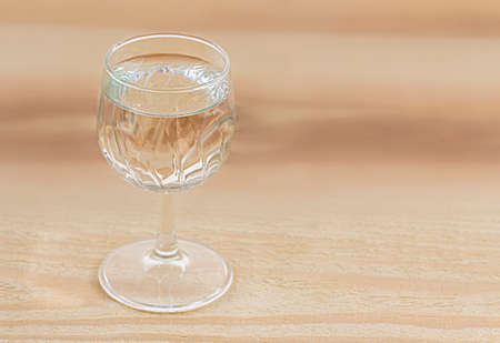 glass of water on wooden table.