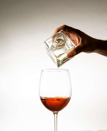 hand pouring cognac into a glass on a light background