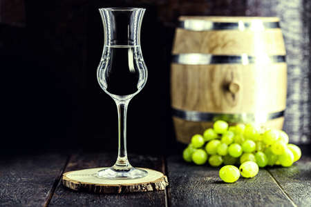 glass of Grappa on wooden background with old oak barrel, grape-based drink, distilled. Selective focus