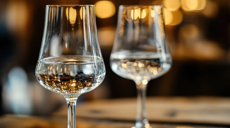 Two wine glasses containing clear water are elegantly placed on a table, illuminated by warm lights creating a relaxed atmosphere perfect for dining.