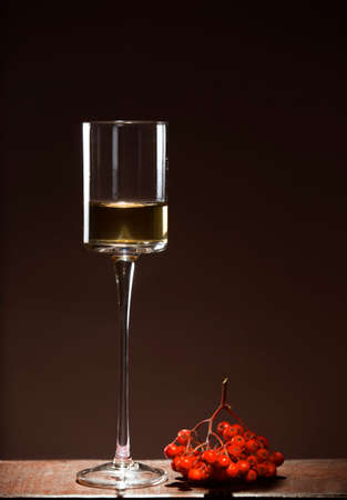 Tall, graceful glass of wine and a bunch of rowan berries on the table