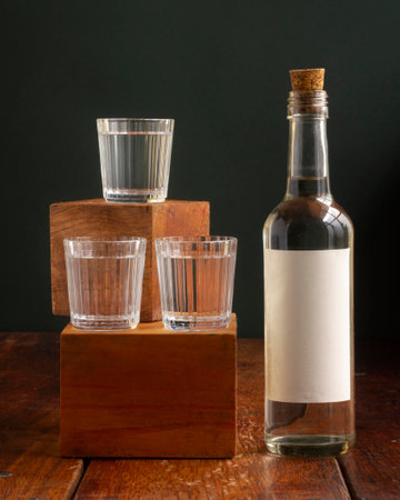 glass and bottle lying down with clear liquor like tequila, mezcal or vodka on elegant wooden background
