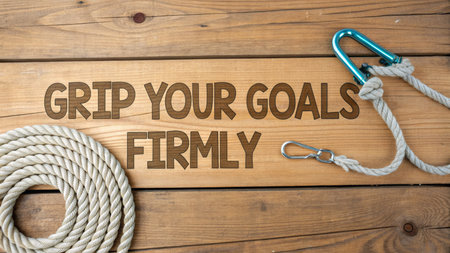 A coiled rope and metal carabiners rest on a wooden plank surface next to the words 'HOLD YOUR GOALS FIRMLY', representing tenacity and the tools for achievement, perfect for motivational content.