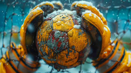 A football goalkeeper catches the ball with his gloved hands during a football match so as not to score a goal.