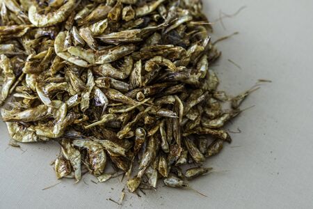 Pile of Dried Crayfish on brown background