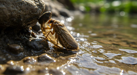 Mayfly Exuvia Shed on River Rock with Glistening Water in Sunlight