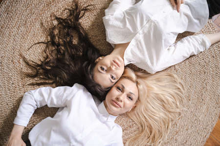 Beautiful blonde mother and lovely brunette daughter lying on round carpet